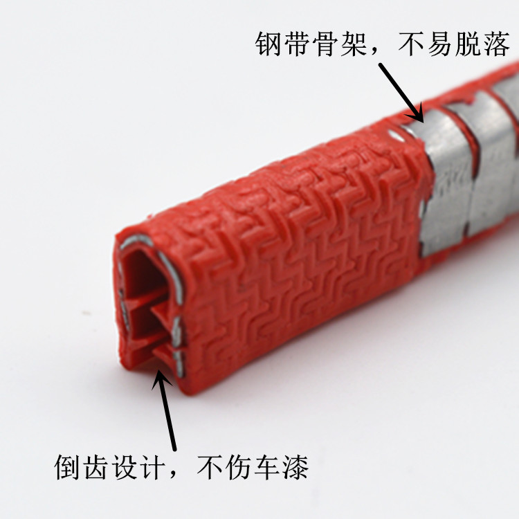 很多密封條都含有鋼帶,像(xiàng)汽車門框密封條、前後機蓋(gài)密封條、汽車內外擋(dǎng)水條、u型裝(zhuāng)飾條等(děng)。鋼帶在密封條起著(zhe)很(hěn)大的作用,為了裝配導槽(cáo),因此,導槽斷麵底(dǐ)部應設計出相應結構,既易於裝入,又能(néng)利用(yòng)密封條自身的彈(dàn)性附著在鋼導槽內,防止其脫出;最後是外搭邊的形狀、尺寸,為了改善外觀(guān),導槽外(wài)飾麵應與車(chē)身緊密(mì)貼合。